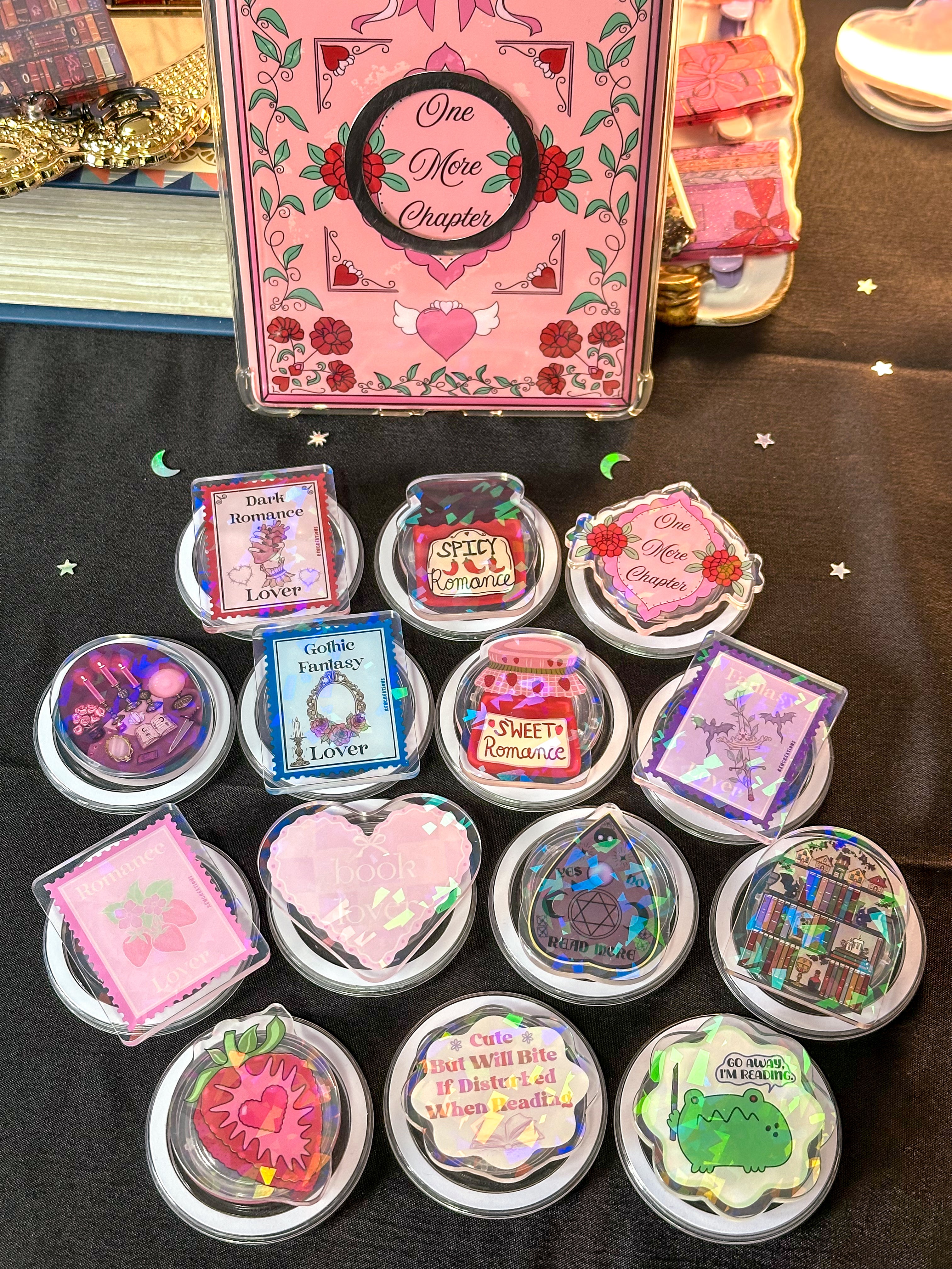Magnetic device grips for your e-reader, phone, tablet, and other devices. Made with holographic acrylic for that sparkle!